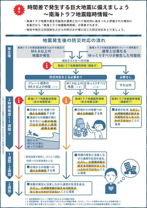 『南海トラフ巨大地震・想定の整理』最終回。 南海トラフ巨大地震が発生した場合、揺れから始まり何が並行して起こるのかを考え「22分類」しました。 今回は最後の項目『⑳南海トラフ地震臨時情報』を考えます。 令和6年8月8日に発生した日向灘を震源とする地震に伴い南海トラフ地震臨時情報(以下、臨時情報)が発表された。 臨時情報には発表基準があり、南海トラフ地震想定エリア内でマグニチュード6.8以上の地震が起こったことで、基準通りに粛々と『南海トラフ地震臨時情報・調査中』が発表され、続いて『南海トラフ地震臨時情報(巨大地震注意)』を発表した。 そこから8月15日の17時までの1週間で「南海トラフ地震臨時情報(巨大地震注意)」の呼びかけは、ルール通りに終了したのです。 さて臨時情報は『何のための情報か?』というと、南海トラフ地震は発生すると被害が非常に大きい一方で、「いつ起きるか」をピンポイントで予知することはできません。 そこで、南海トラフ巨大地震が「いつもより起きやすい状態になった可能性がある」と気象庁が判断したときに発表される情報です。 通常より巨大地震のリスクが高まった兆候が見られた場合に、国民や自治体が事前に備えを強化する判断材料として発表されるのがこの「臨時情報」です。 決して、避難命令などではなく「心構えと備えを強めてください」という合図です。 臨時情報は『どんなときに出るのか?』というと、気象庁が南海トラフ沿いで大きな地震が発生した場合や、プレート境界で異常なゆっくりすべりが観測された場合、その他、巨大地震との関連が否定できない現象を観測・評価した場合に発表されます。 臨時情報は情報の種類が状況に応じて4つの区分に分かれています。 『①調査中』は、何か関連があるかを調べているという段階です。 『②巨大地震警戒』は、発生の可能性が相対的に高まったことで自治体は事前避難などを検討します。 『③巨大地震注意』は、可能性がやや高まった状態であり、家庭・地域で備えの再確認をしましょうというものです。 『④調査終了』は、関連性は低いと判断された場合に発表されます。 臨時情報が発表された場合、私たちは何をすればいいでしょうか? 臨時情報が出たら『家具固定・非常持出袋の再確認』『家族や職場での安否確認方法の再確認』『避難先・避難経路の再確認』『高齢者や要配慮者の支援体制の再確認』をしましょう。 つまり特別な行動よりも「備えのギアを一段上げる」程度の感じで良いでしょう。 しかしながら、発表後に多くの勘違いが発生したのも事実です。 ×「臨時情報発表時=必ず地震が起きる」 〇「いつもより注意が必要な状態」 ×「情報が出ていない時=安全」 〇「南海トラフ地震は常に起こり得る」 さて、「備えのギアを一段上げる」とはどういうことかというと、生活を止めるほどではないけれど、いつ起きても動ける状態に近づけておくということです。 具体的に考えてみましょう。 1.『まずやること(その日~数日以内)』 今すぐできる低負荷な行動が良いでしょう。 非常持出袋の中身を確認(水・食料・懐中電灯・電池・常備薬・モバイルバッテリー等)やスマホ・モバイルバッテリーを常に満充電にしておくことです。 そして家族や周囲の人と「もし今起きたらどうするか」を簡単に共有しておきましょう。 「昼間なら○○、夜なら○○に集合」ということです。 ただし、備える物も新しく買うより『確認すること』が重要です。 2.『家の中の危険を減らす』 被害を小さくする為のギアアップです。 寝室・居間の家具の転倒防止を再確認しましょう。 (特に「頭の近く・出入口付近」)、落ちやすい物を一時的に低い位置へ移動することも重要です。 寝室には、スリッパや靴を置く等も地震直後のケガ防止となります。 3.『行動を具体化する』 もしもの時に、迷わず動ける状態にしておきましょう。 避難先を「候補地」から「行く場所(第一・第二候補)」を決めることが重要です。 また、そこに行くまでの避難経路を1回、頭の中でなぞったり、実際に歩いてみるのも大切です。 更には、要配慮者(高齢者・子ども・障害のある方)との役割分担の確認も、決めておくことが重要です。 4.『生活を少しだけ防災寄り』 平常生活を保ったままで強化しましょう。 食料・水をいつもより多めにストック(ローリングストックでOK)、自家用車のガソリンは半分以下にしないとか、洗濯・入浴・給湯を早めに済ませておくことも、起こる事への不安予防になります。 5.『自治体・地域の動きを意識する』 個人から地域へギアアップしましょう。 市町村の防災メール・HPをこまめに確認したり、「警戒」が出た場合は、自治体の指示を最優先に考えて、地域の避難情報・避難所開設情報に注意することはトテモ大事な考え方となります。 × 一斉避難・パニック行動をする 〇 起きたらすぐ行動できる状態を保つ つまり『備えのギアを一段上げる』とは平常と非常の間に